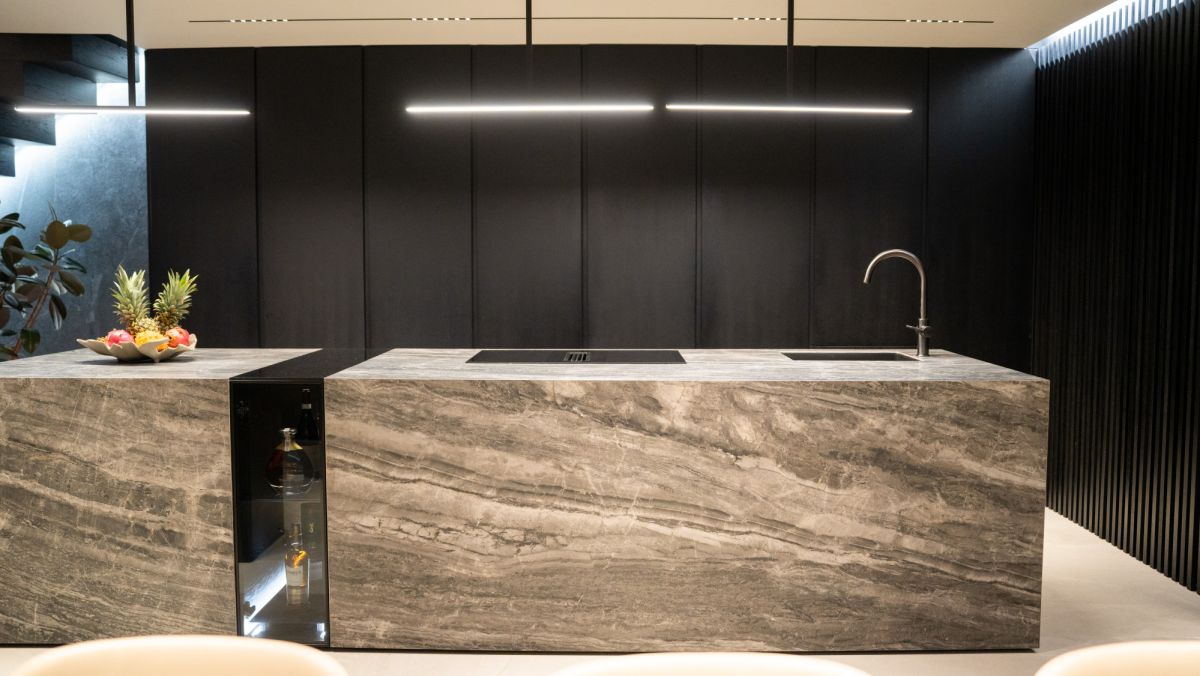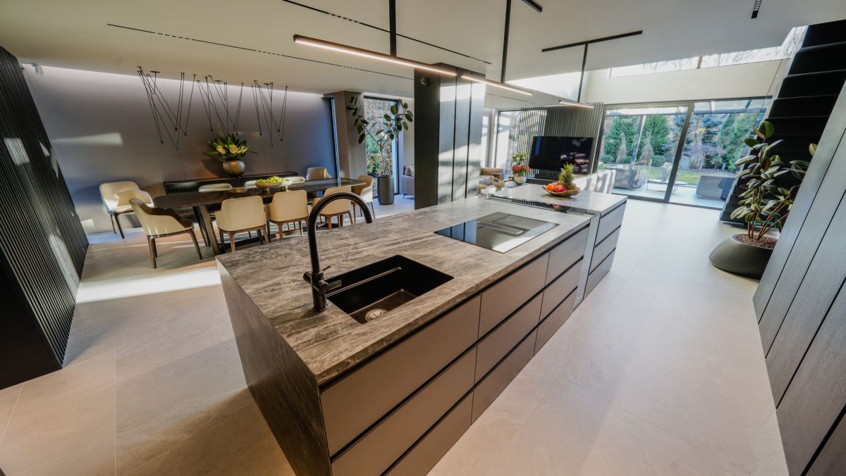 - otwarta kuchnia z wyspą, wykonana na na indywidualne zamówienie ze sprzętami Miele najnowszych kolekcji,