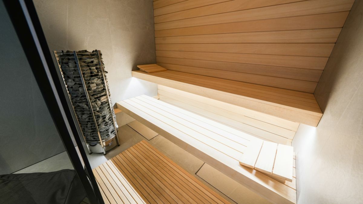 - strefa SPA z basenem wewnętrznym przelewowym DIAMANT ELITE o wymiarach 7,55 x 2,6 x 1,45m, sauną oraz prysznicem i wyjściem na ogród, gdzie znajduje się zewnętrzna strefa rekreacyjna. Dodatkowo w pomieszczeniu sufit akustyczny Silent Board, tynk akustyczny w kolorze jasnoszarym oraz profesjonalny osuszacz basenowy Dantherm.